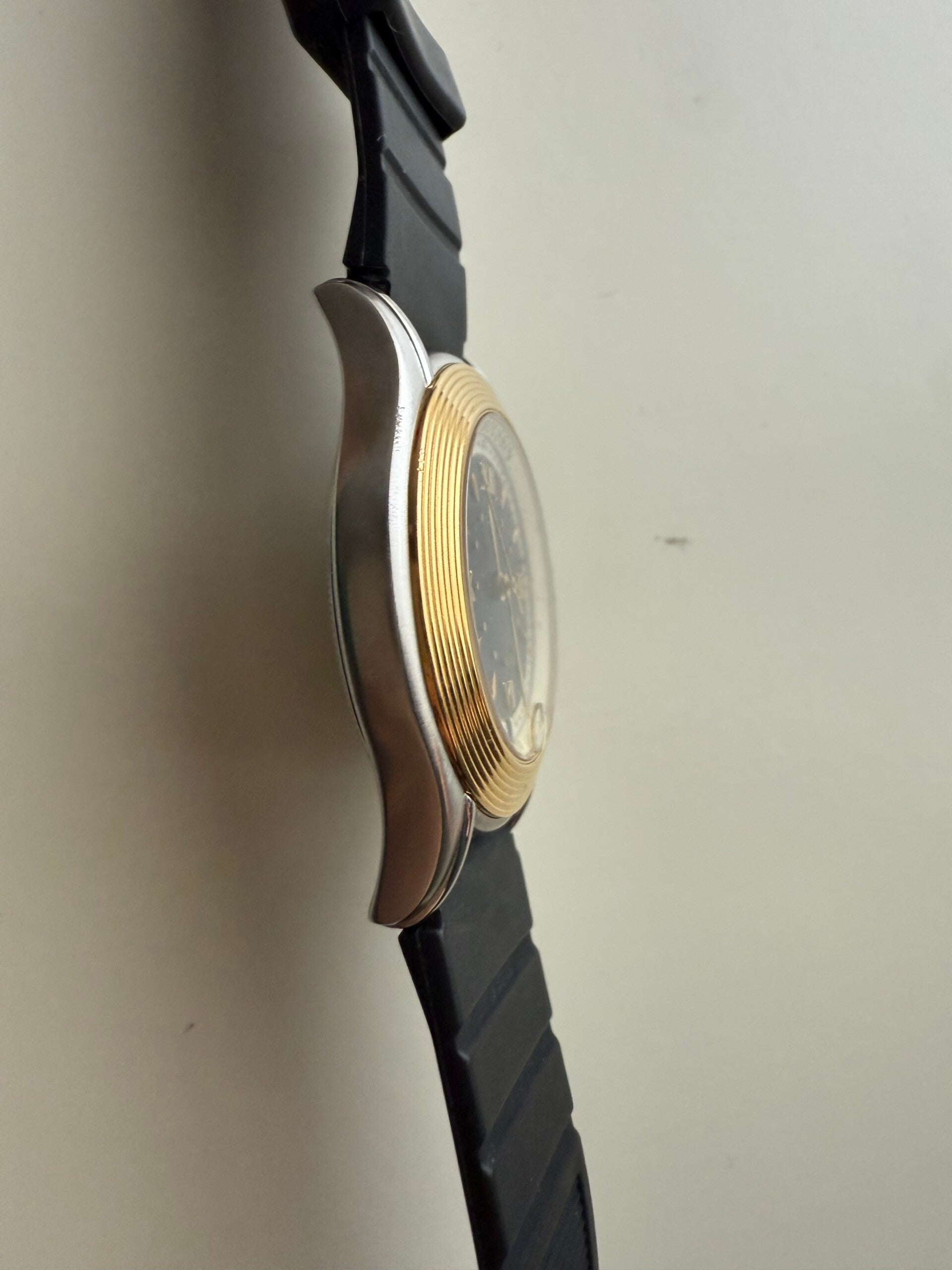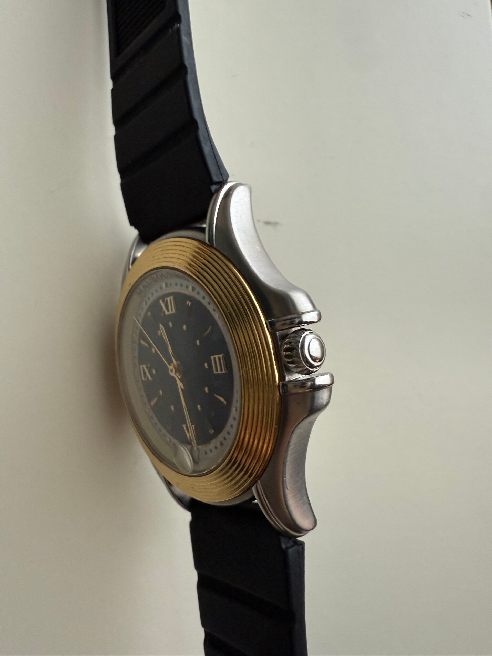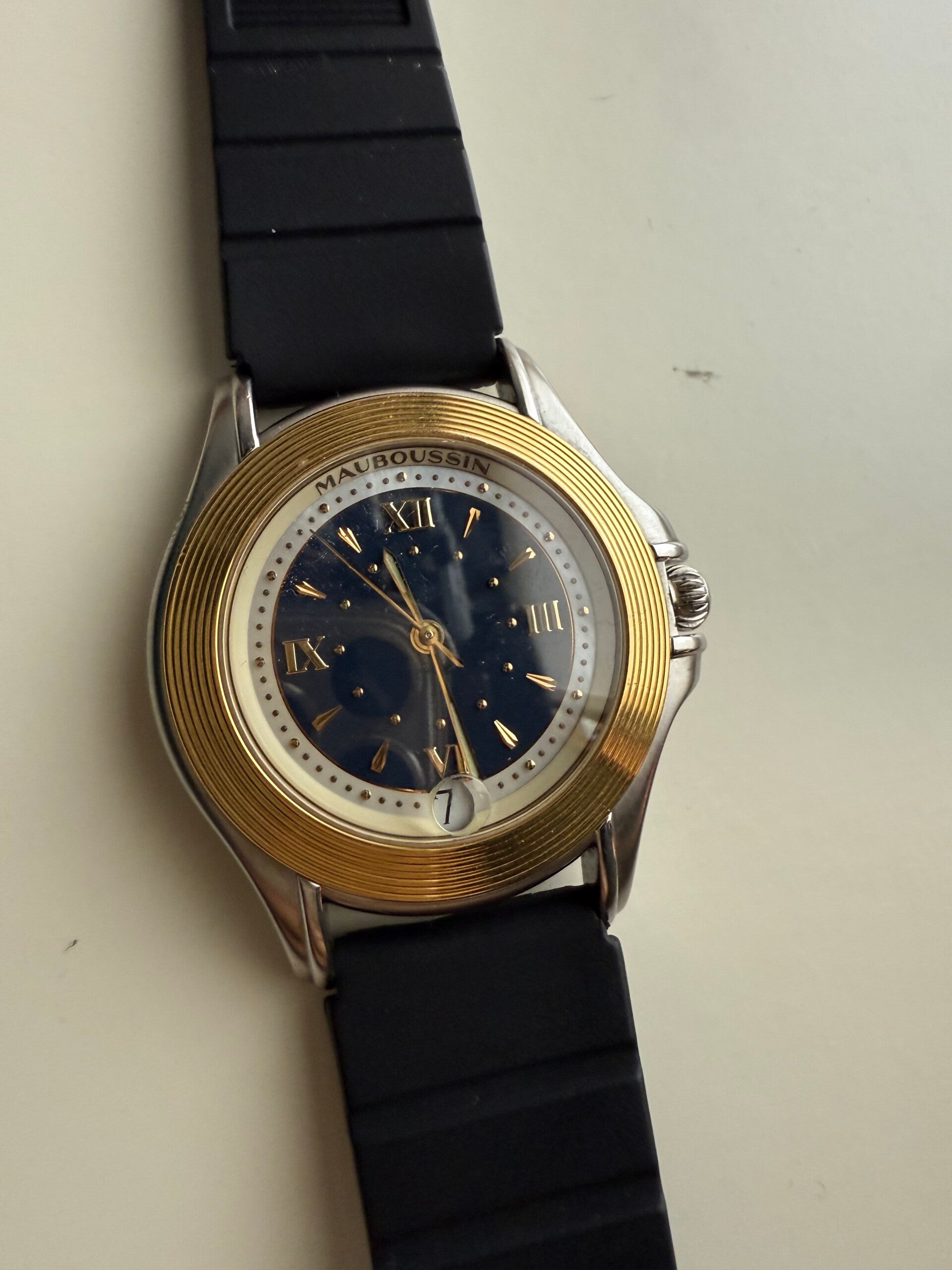 Prachtig Mauboussin heren polshorloge, referentie R.02458. Dit automatische horloge heeft een kast van staal en 18 karaats geelgoud, een transparante achterkant waardoor het uurwerk zichtbaar is, en een tweekleurige blauw-witte wijzerplaat met elegante Romeinse cijfers. De datumaanduiding bevindt zich op zes uur. Het horloge komt met een sportieve band, maar met een leren band straalt het klasse uit. De diameter is circa 35 mm. Een stijlvol horloge dat zowel sportief als gekleed gedragen kan worden. Krasvrij!