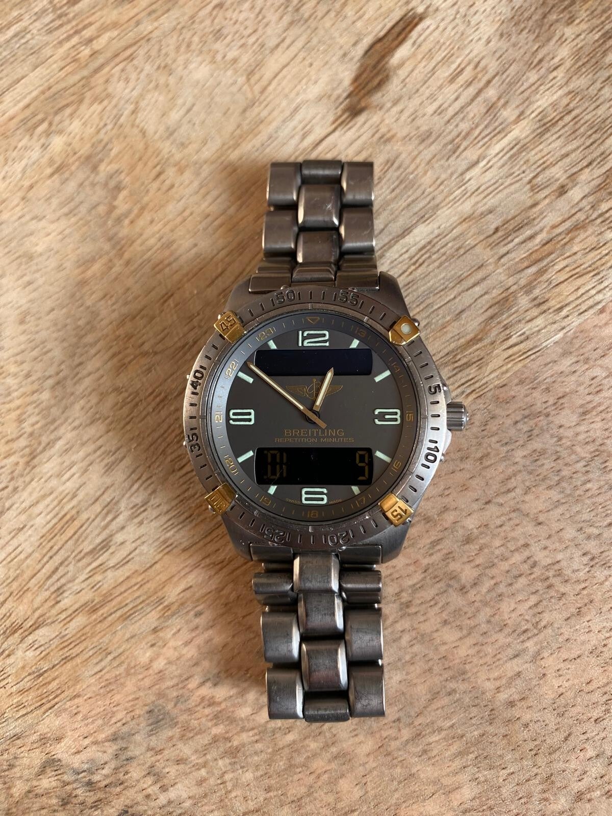 Prestigieus en zeldzaam Breitling-model Aerospace in titanium, werkend, grote diameter voor heren van 39 mm zonder kroon, prachtig grijs wijzerplaat met dubbele display, draaibare bezel, Breitling titanium band met enkele licht vergulde inslagen die licht vervaagd zijn. Lengte 20 cm. De Aerospace is uitgegroeid tot een ware cultklassieker van Breitling.
