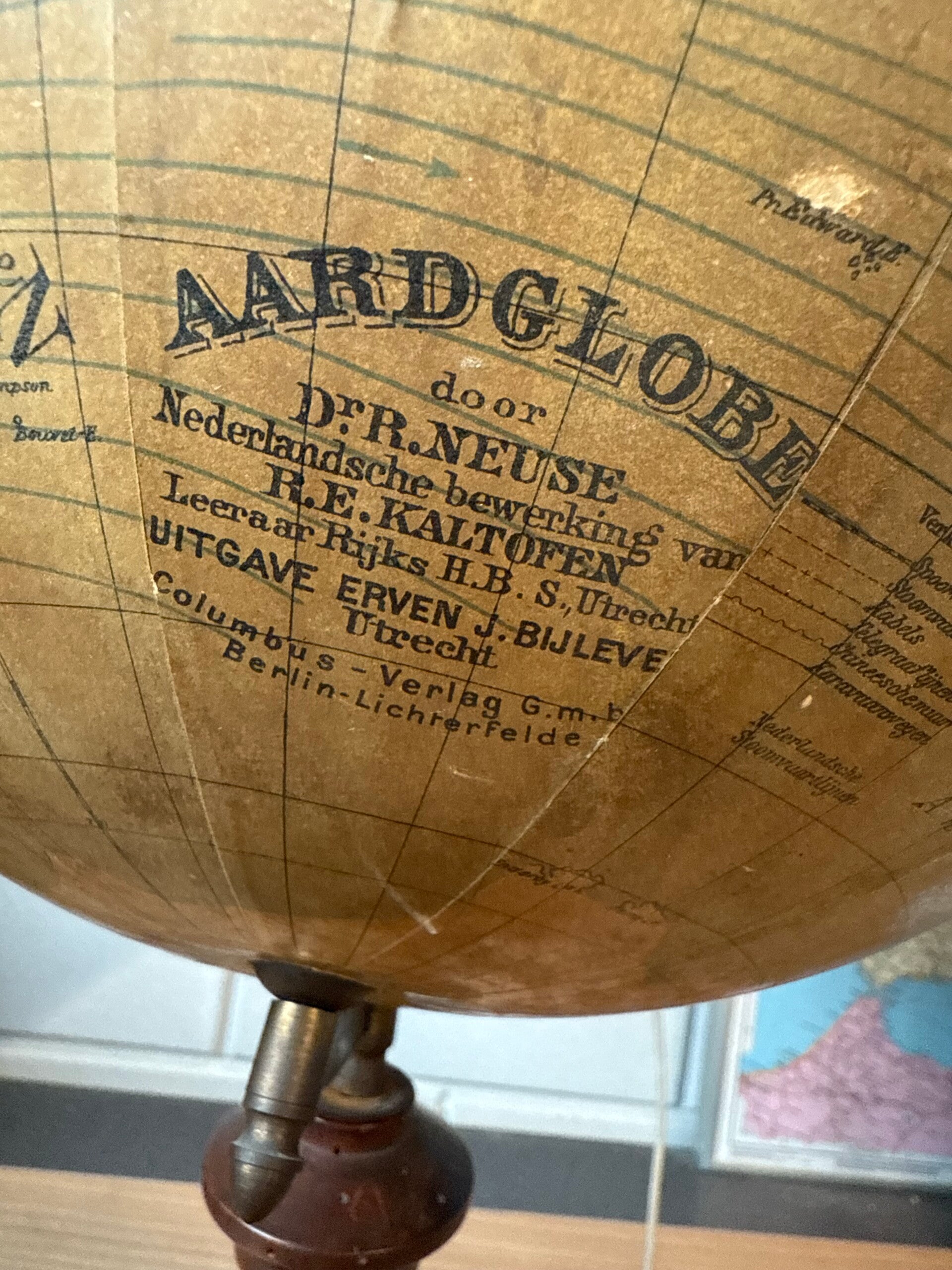 Prachtige antieke globe / wereldbol, gebaseerd op kaarten van Dr. Neuse, met een messing gradenboog en een houten voet. Uitgegeven door erven J.Bijleveld (boekhandel/uitgeverij). De globe is een zogenaamde Columbus-globe, uitgegeven door Columbus Verlag met Nederlandse bewerking van R.E. Kalthofen, leraar rijks H.B.S Utrecht. De globe dateert uit ca. 1929. Peiping wordt Peking in 1928 en Constantinopel staat vermeld, wat in 1930 Istanboel werd.