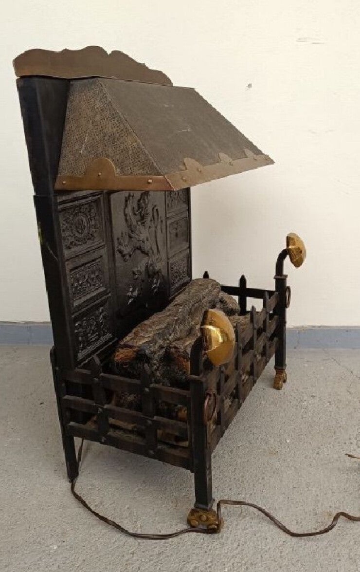 Antieke messing elektrische kachel. Deze kachel kan functioneel gebruikt worden of als decoratie. De afmetingen zijn 78x58x33 cm. Het heeft een leeuwenmotief en is gemaakt van messing en metaal.